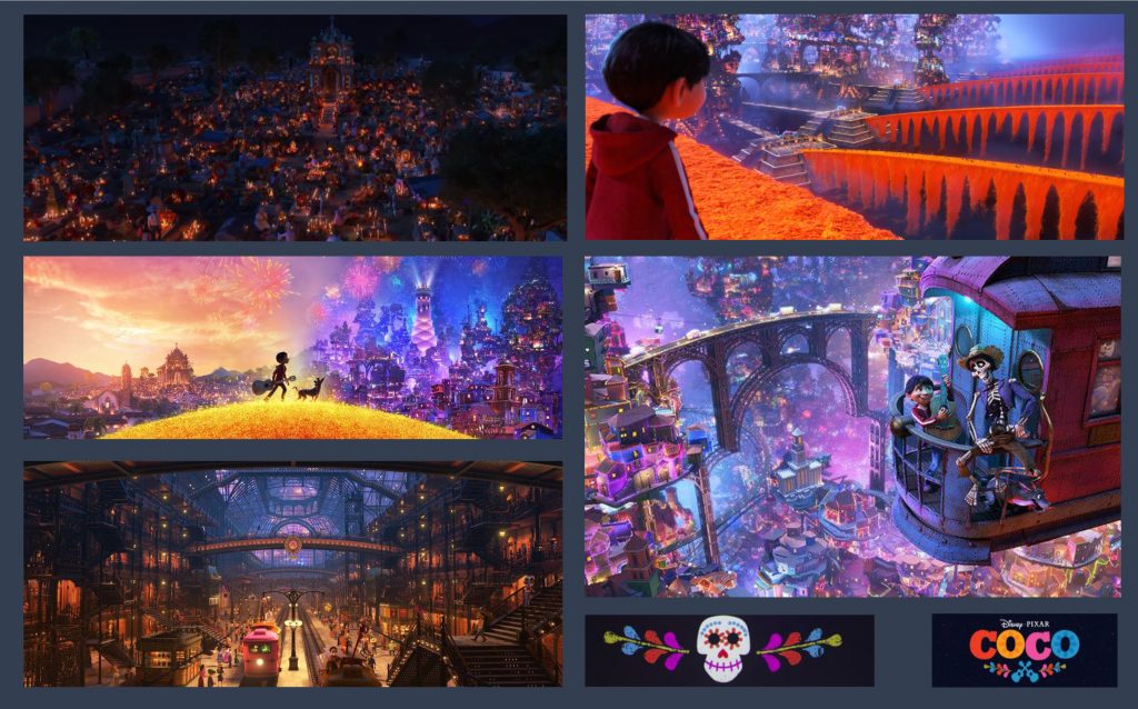 Siendo un film animado cuyo público es infantil, por regla general, creo que la apuesta por introducir y naturalizar estos temas a los más pequeños ha sido un acierto. Mi hijo, está ya bastante normalizado en la materia perdiendo a sus dos queridos abuelitos a la vez, pero al acabar el visionado de la misma, todos, la mayoría los niños/as, mi hijo incluido, aplaudieron a rabiar… y es que algo está cambiando o eso pensamos desde MEMOORY. Quizá imaginarnos tal como nos lo muestran aquí que el «mundo de los muertos» está genial, nos ayude a no vivir con esa presión y miedo a desaparecer de este ansiado lugar. El tratamiento de los espacios, los contrastes, el colorido, la magia,la iluminación, los toques efectistas son apabullantes y la arquitectura es una auténtica delicia. Los dos universos *el real* y *el de después* nos lo cuentan a través de una preciosa historia de un niño en Méjico, con la especial celebración de su *día de los muertos*. Juega con la inocencia y ganas de exploración de un niño con la experiencia y los prejuicios de cuando nos hacemos mayores haciendo hincapié en los verdaderos valores de lo real e importante de esta vida….y podría seguir analizando cada detalle, cada moraleja, cada plano, porque todo está pensado para llegarte al corazón directo a traspasarte hasta los huesos, en esos que después nos vamos a quedar, luego a reducirse a polvo…a polvo de estrellas!